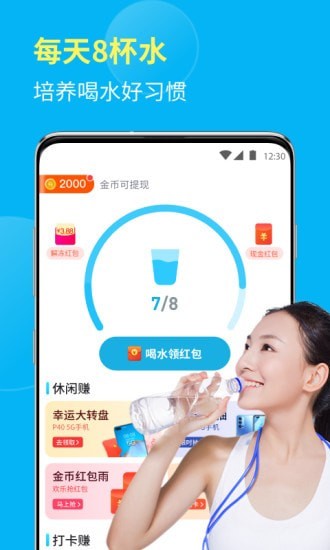 全民喝水是一款能够让我们在手机上通过打卡的方式获得更多的收益软件平台,是可以直接选择自己感兴趣的打卡任务去完成,每天通过打卡的方式赚到的收益还是非常不错的,帮助我们轻松赚钱,每天定时提醒喝水,还能抽5G手机,有着很实用提醒喝水功能,每天的任务记得做,一天下来能攒不少金币哦,集合了打卡、游戏、红包等多种赚钱福利的,快下载吧。