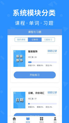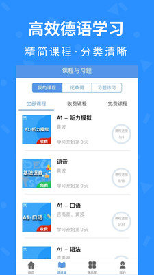 2.用户不仅可以学习到德语不同等级的课程,还有对应的分类单词表、习题练习,