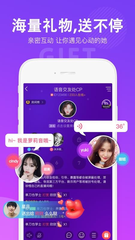 1.礼物特效,在游戏、唱歌和聊天房间之内如果喜欢一个人的话可以赠送虚拟礼物;