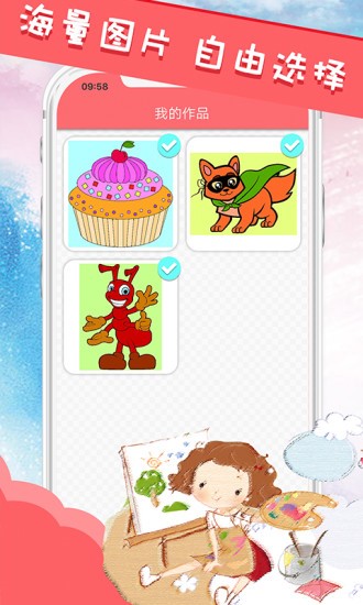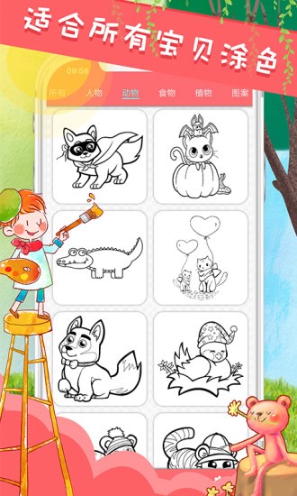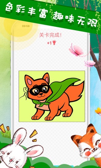 1.超多卡通风图片不断更新,无论是风景,动物,人像全都有,按照正确操作完成涂色。