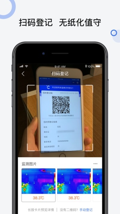 通过测温精灵,值守人员可使用扫码或者语音采集的方式来实现人员信息和告警信息快速关联,实现无纸化的电子登记,加快值守人员信息采集速度,增强人员通行效率。测温精灵还可以适应多种现场值守的管理方式,在一人负责多设备、多人负责一设备的情况下,能支持设备切换监测、多人协同监测处理。