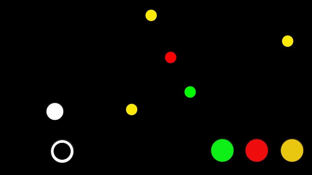 圆的战争这款游戏的玩法简单,但难度极大玩家操控白色的本体,发出三种颜色的子弹:绿,红,黄,克制规则:绿吃红,红吃黄,黄吃绿,只能通过颜色的克制消灭不断飞来的圆点。