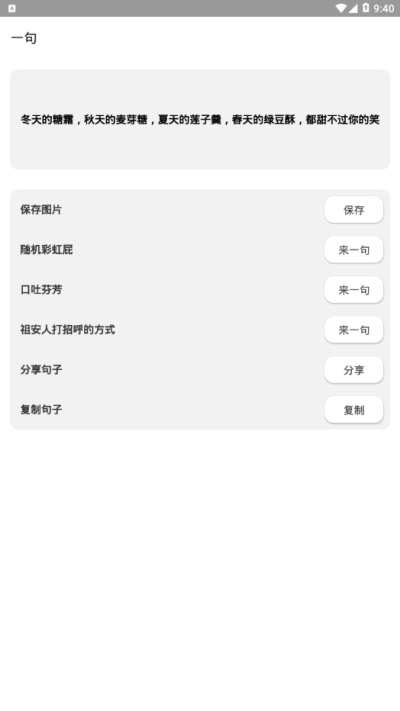 一句彩虹屁(一句)是一个怼人必备的软件,在这个软件上可以一键生成各种语句,用户们可以选择自己想要生成语句的用途就可以生成,使用非常方便,点击再来一条,直接复制就可以发送,有了一句彩虹屁这个软件从此怼人就是如此简单,而且再也没输过!