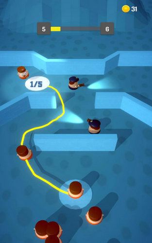 后面会增加很多的内容,收集的金币能去商店买很多好东西,极简的操作不需要任何技术,轻轻在屏幕上一划就能移动小人。被手电筒照到直接就完蛋了,只有达到任务的人数才是完美通过。不然所有人都会被抓起来处罚;用过关的速度来证明你的能力。