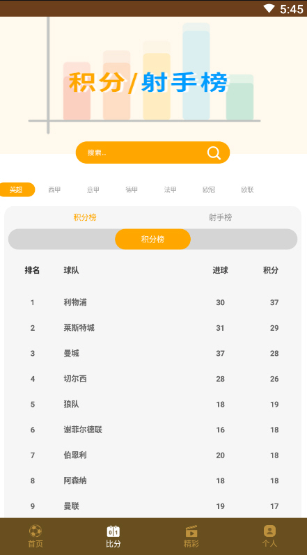 2.有最新最全面的赛事情况,每一支球队的积分会清楚显示;