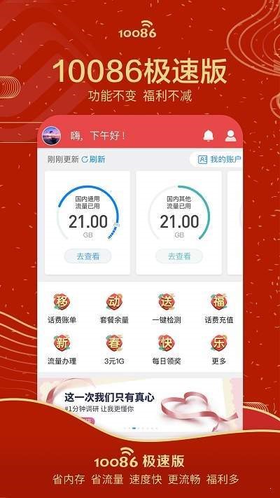 10086极速版是很专业的手机服务软件,为用户提供许许多多的便捷功能,包括话费查询、套餐查询、套餐选购、花费充值等。还有许许多多的优惠活动等待用户的参与,需要的用户不要错过。用户随时可以在线查询自己的手机话费使用情况,各类手机套餐查询,套餐选购、账单等,在线办理各项业务等,有需要的朋友可以下载