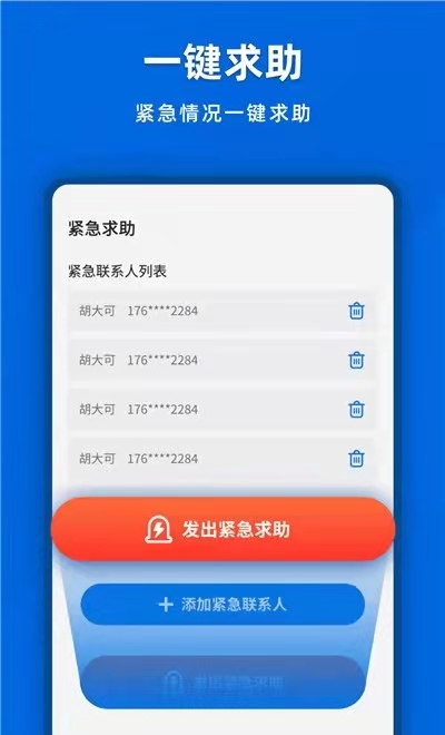 紧急联系人:遇到危险不用怕!紧急联系人一键呼救。