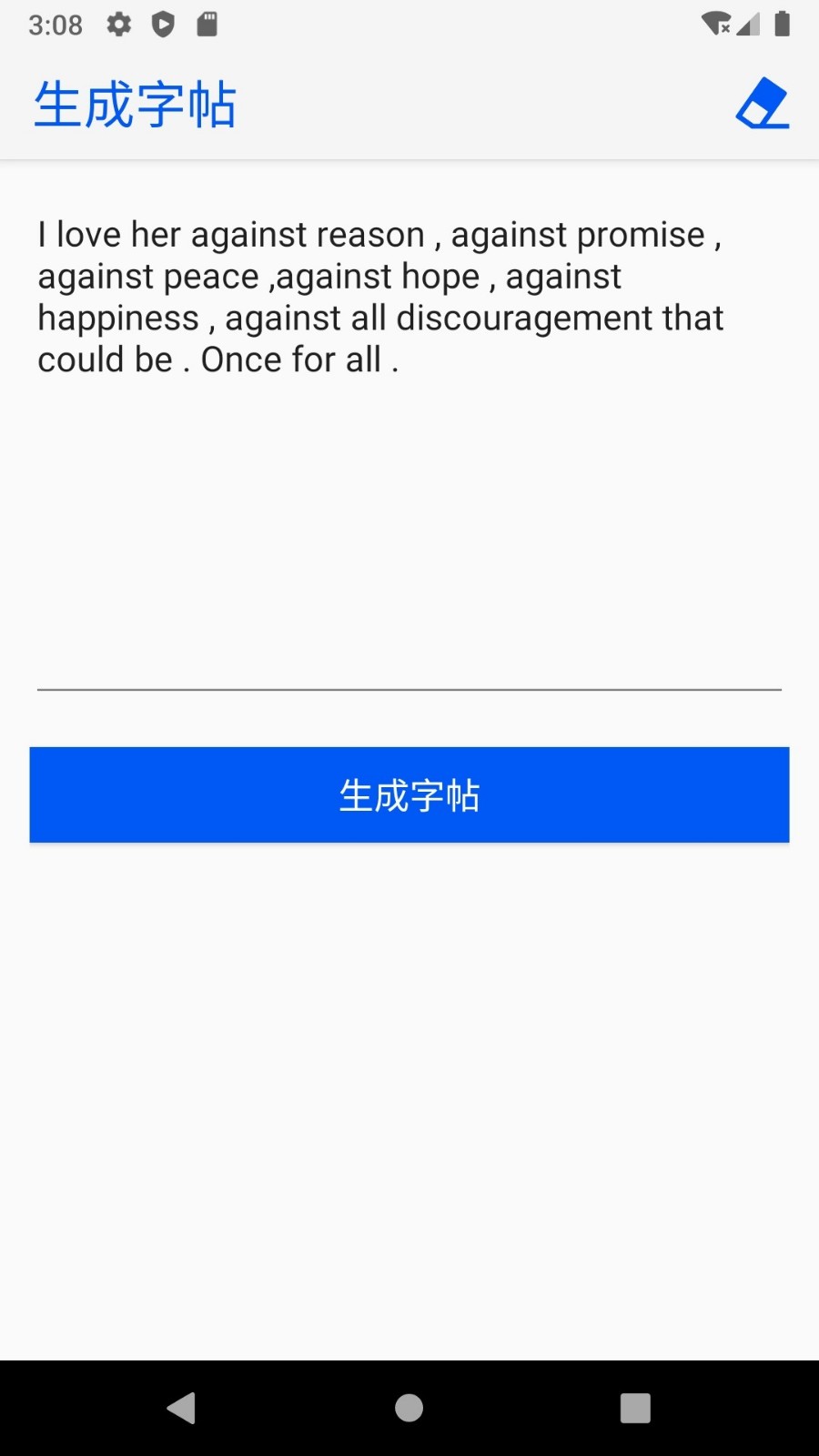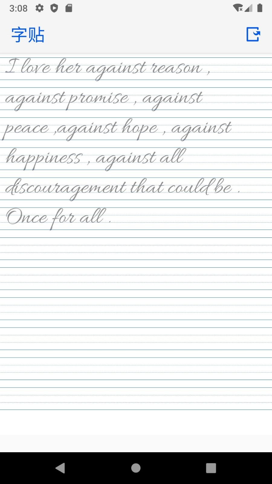 英文书法是一款非常好用的书法练习软件,这里是专门针对英文推出的书法练习软件,这里有各种英文书法教材,让用户们在手机上也能够练字,轻松练得一手漂亮的字,感兴趣的话就快来下载吧!用户可以从中选择自己喜欢的字体来进行练习,同时平台上面也有字帖进行提供,而且字体内容还可以自己自定义进行生成哦!