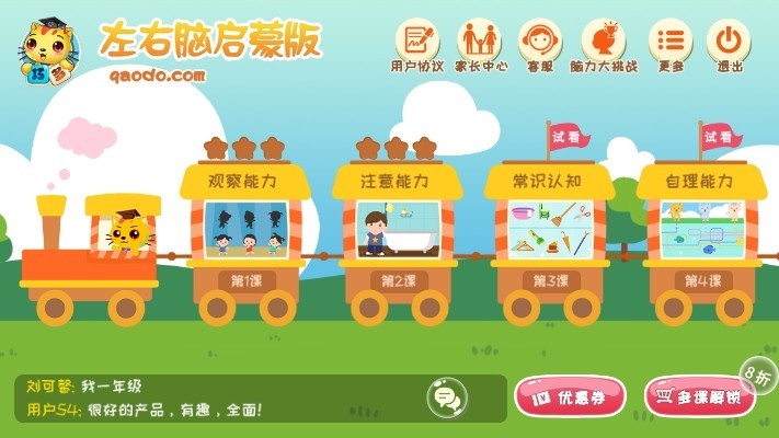 2、脑力大挑战相当于一个综合训练,分别配置一个侧重左脑能力的游戏和一个侧重右脑能力的游戏,让孩子在游戏中刺激脑力,激发潜能。