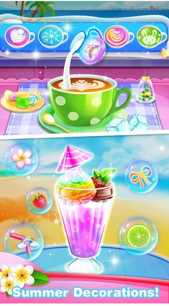 猜猜我发现了什么!咖啡馆的高级咖啡师们,正在计划举办一场免费的冷饮派对!这简直太棒了! 嗯,我很擅长搅拌水果,而且我做的冰淇淋在女孩里也是畅销品!所以,我能加入这个盛会么?给我个机会,让我展示一下果汁之王的风采吧!玩家在游戏中体验自己的冒险,丰富多彩的游戏内容,各种各样的刺激挑战,玩家可以轻松的制作冰凉的冷饮,游戏的画面充满来夏天的气息,不断完成挑战,解锁更多食谱,各种材料都可以在商店里买到,自由制作各种饮料,让更多的顾客满足来赚取金币。