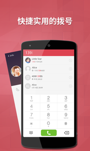 2.拨号:将拨号盘,通讯录、通话记录整合到一个界面,同时配有智能文字头像功能。