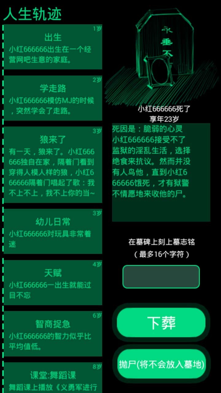 《逗比人生》如同它的名字一样,你在游戏中需要做的只有一件事,走完一个属于“你”的人生。这段人生或是普通,或是奇幻,反正结局的画风一定非常逗比的。不信就来试试吧。《逗比人生》是一个有关人生的游戏,玩家可以创建自己的角色,在这个逗比的社会中经历一生。死后还可以将自己的坟墓与朋友分享。游戏内事件会根据角色的选择发生改变,一些事件也会随机发生。事件全靠玩家贡献,你也可以将你的想法,提交给作者,写进游戏中。