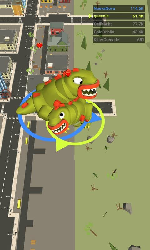 2、卡通3D的游戏画风,在不同的城市场景里自由的摧毁各种比自己小的东西;