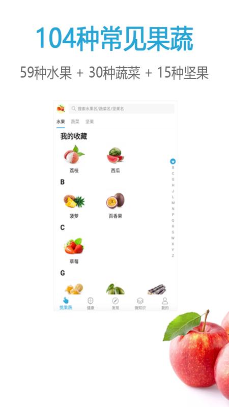 这里收录了104中果蔬的信息,用户可以查询任意水果、蔬菜的信息;