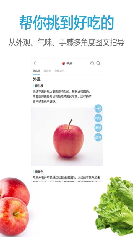 能够教导用户如何挑选到好水果,可以从外观、气味、手感进行指导;