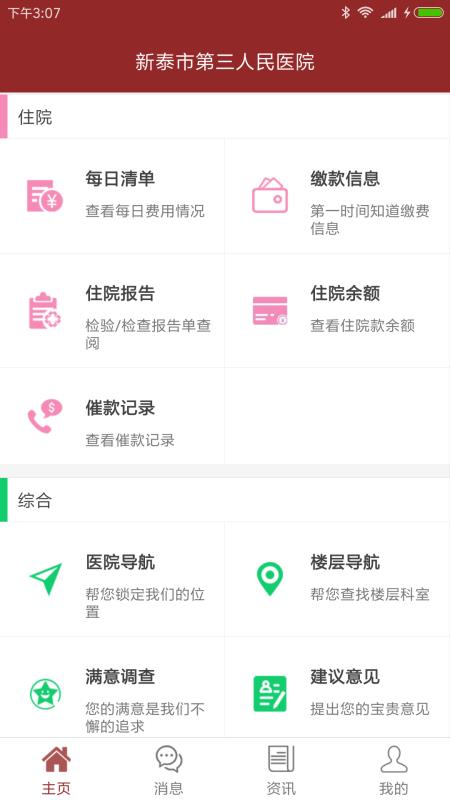 新泰市第三人民医院app是新泰市第三人民医院的官方app,内设科室医生,就诊指南,门诊报告每日清单等医药日常处理事务;大分类有门诊,住院和综合,综合包括的就是医院就诊导航和就诊建议,还有就是满意度的调查等等;门诊报告可以直接就在此app上查看,避免了排队从而浪费时间,每日清单可以查看到你在医院是每天的消费使用情况。住院余额上面可以随时查看到您的医院余额还有多少,从而避免一些因为信息延误而导致的医疗纠纷,本应用致力于为患者解决实际问题,为医院减少不必要的工作量。