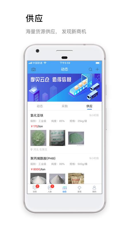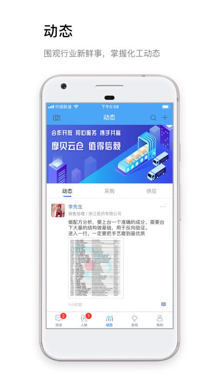即时交流消息,掌上沟通更便捷 发现:掌握化学品数据,共享商务圈层