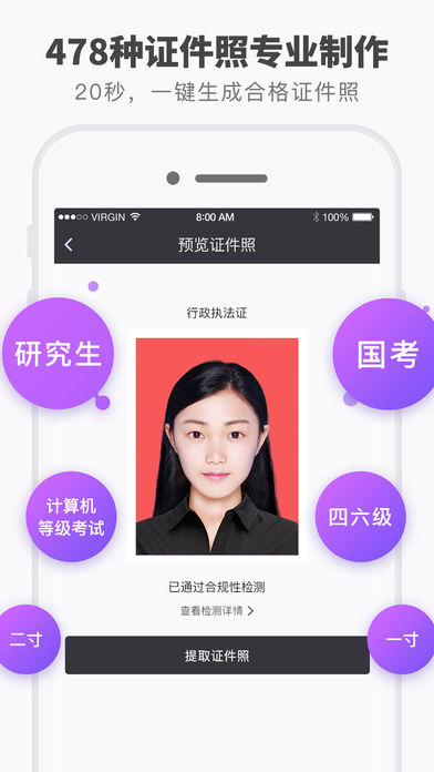2、专业的证件照检测,各种不同用处的证件照都可以拍摄符合规定的。