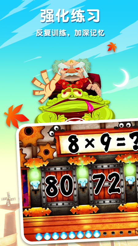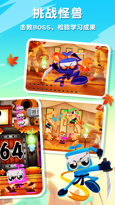 乘法忍者挑战手游是一款能让孩子们可以特别开心的学习各种数学课程的游戏平台,每一个游戏关卡都会让学生们学习到不同的数学知识,而且通过在游戏中学习能更好的去激发孩子们的学习兴趣,一边愉快的玩游戏,一边学习知识,可以让学生们更好的沉浸在学习的氛围之中。这里有海量的学习资源,涵盖了各种课程主要以学习乘法表为主,这里还有相应的乘法题库,帮助你查漏补缺,培养孩子的兴趣和专注力,提高学习的质量和效率,感兴趣的用户欢迎下载哦~