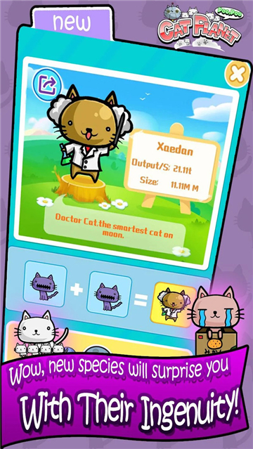 猫咪星球便便游戏是一款可以养成各种种类的小猫咪的模拟养猫游戏。采用的是卡通的画风,在这里合成游戏中的猫咪,完成游戏中的考验,将两只完全相同的猫拖到一起,就会产生另一只新的猫。猫可能会给你硬币,它们是你的主要收入。用你的硬币在商店里买一些新的猫。用你的硬币来升级你的技术来加速你的成长。更高的技术水平意味着离线时更高的收入,更快地获得新种类的猫。游戏会让你体验到有猫的生活是多么快乐。游戏完美的模拟了养猫的一写过程玩法等,十分适合喜欢小猫咪的玩家哦!
