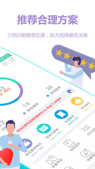 可查询全国3730所院校在不同省份的招生预测分数线和名次线。提供按照省份、学校类型等关键字筛选,随时可以根据自己的目标定位高校,让考生对自己的分数、名次情况一目了然。