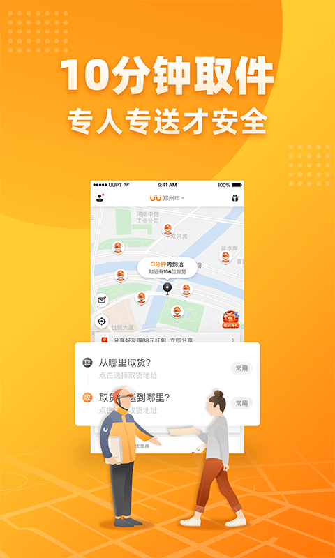 uu跑腿app是一款更快速、更便捷、更安全同城快递软件。这款软件能让用户想要赚钱的时候可以直接在这里找单去完成,每完成一单就有现金可以拿哦,为用户提供高效快捷、环保的贴心服务。客户无论在郑州的什么位置,都可以通过网络下单请求跑腿服务。系统会将订单推送到客户周围的跑男手机上,跑男就近进行抢单并以最快的效率完成。全程只由唯一的跑男专门完成,满足用户的同城直送所需!马上来下载使用吧。