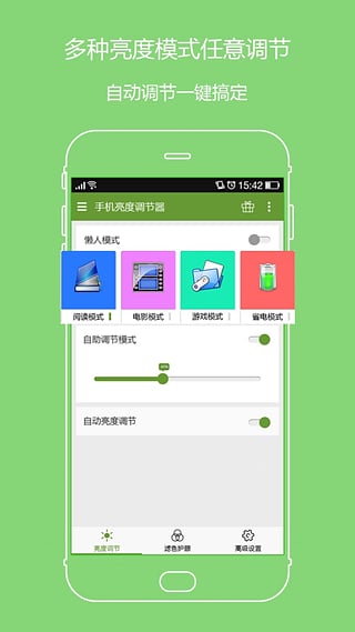 手机亮度调节器app是一款很好用的护眼软件,现在很多人喜欢睡前关了灯玩手机,但是手机的亮度往往会很不舒服,手机亮度调节器app为用户提供了多种场景的亮度和色温调节功能,方便用户快速调整,让眼睛看手机更加舒适,需要的朋友赶紧下载吧。手机屏幕亮度调不到自己预想期的状态吗?小编今天给大家带来了一款运行在android平台上的手机屏幕亮度调节器,这是一款调节屏幕亮度的神器,能够一键开启护眼模式或清晰模式,能够过滤蓝光、保护视力、降低屏幕亮度,还不到100kb的安装包,完全不占用空间!屏幕亮度调节app还轻松护眼采用优化算法,过滤屏幕不同频率的有害蓝光,同时保证屏幕效果依然清晰自然。建议您开机自动启用护眼效果,让轻松护眼为您的眼睛健康保驾护航,欢迎有兴趣的网友下载免费体验。