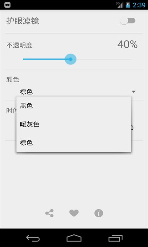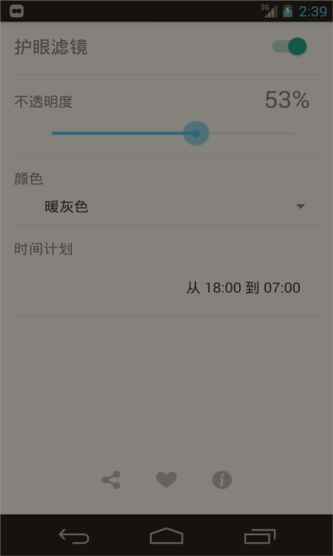 软件体积小,操作简单。软件启动后能过滤手机屏幕有害的蓝光,还能降低屏幕亮度,使屏幕更柔和,不刺眼。