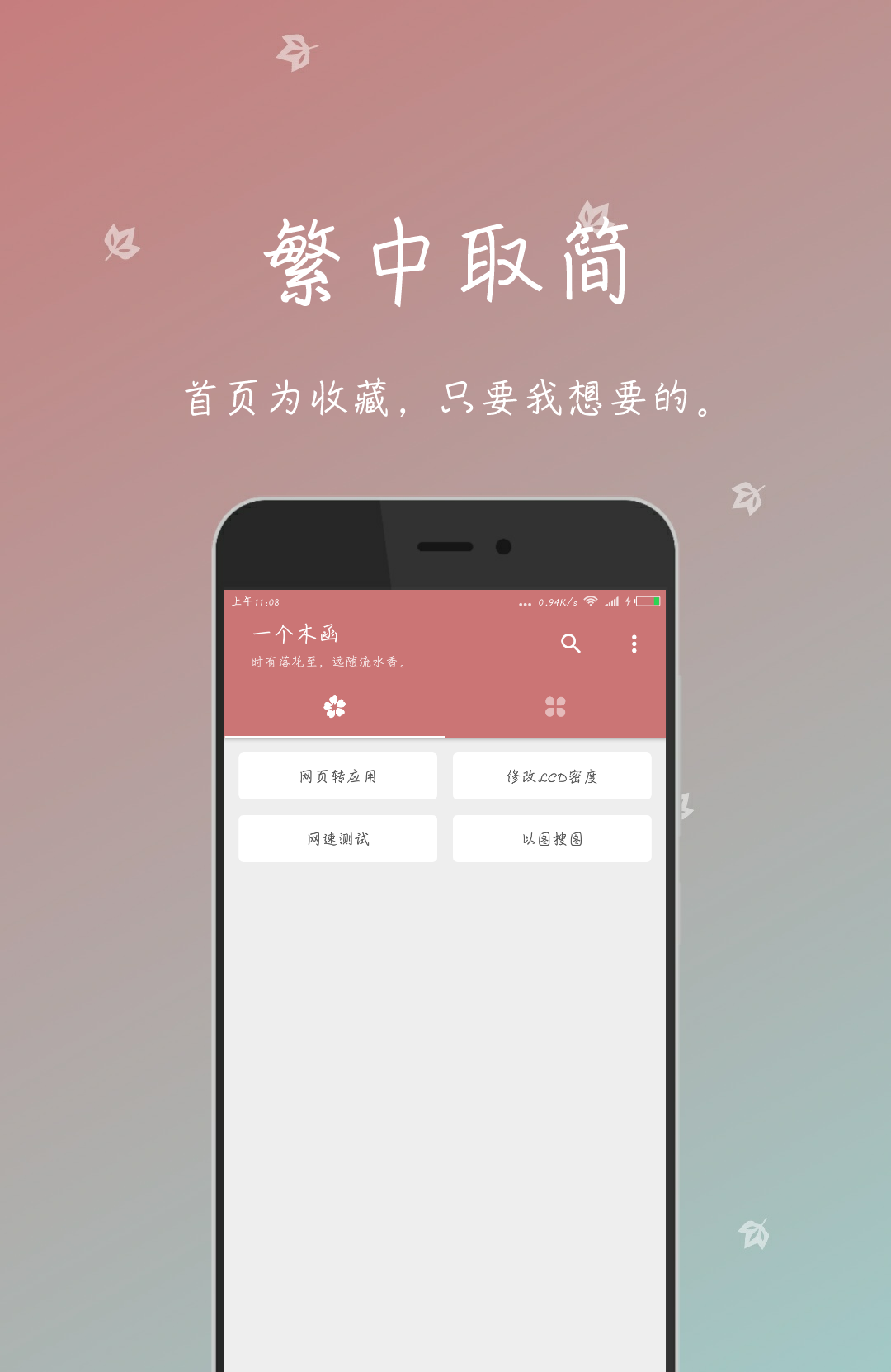 一个木函app主要包含了以下一些不错的功能:应用管理(预装卸载、查看权限、复制信息)文字处理(文字编码、提取、替换、叠加)中英互译字典、词典WIFI密码查看微云直链解析BiliBili视频解析、封面获取修改LCD密度、修改设备名称无需其他操作让设备支持访问谷歌qq拉圈圈、音乐加速、音乐解析、强制会话、隐藏名片二维码、短网址生成