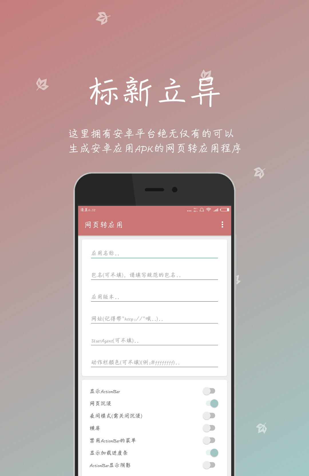 它拥有着安卓平台唯一的,且自定义项极多的"真正意义上的"网页APP制作功能,可让我们使用上一些毒瘤APP的网页安卓APP并卸载掉官方毒瘤版,以及还有许多其它用途,如制作个人博客网页版APP等,且编译之快宛若疾风扫秋叶。