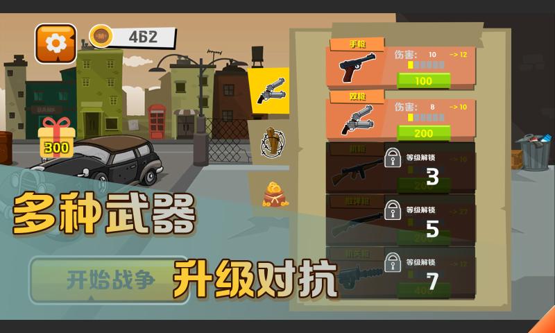 帮派战争是一款以黑手党为题材的帮派战争游戏,采用了卡通画风,玩家在游戏中将和黑手党战斗,加入到帮派斗争的活动之中,在这里将会体验到各种好玩的战斗模式,玩家可以轻松操作自己的人物参与到帮派战争中,你将独当一面,一人对抗整个黑手党。你可以升级你的枪械,提升战力,或者加固你的防御工事,提升你围墙的防守能力,施展出神级操作,将整个黑手党清扫干净,你就是街区的霸主!