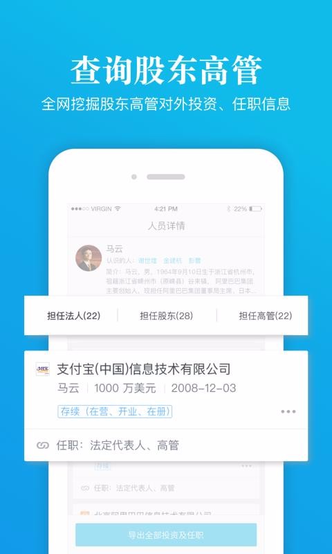 轻松掌握企业人事任职情况,帮助用户更高效的查询股东、高管等人士;