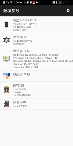 隐秘参数app可以帮助我们读出很多软件中的隐藏参数,让我们能够更加了解我们的手机,清洁起来也就更加得心应手了;使用这款软件就能快速读取到手机的参数信息,让大家更加了解自己的手机参数,通过改变手机参数就能让手机变得不同,玩出一些新花样。一键查看手机各种参数内容,使用简单,轻松查询,方便又快捷。支持检测系统基本软件版本信息;支持检测CPU、GUP、存贮等硬件信息;支持检测屏幕基本信息;支持检测电池基本信息等;支持WEB 3D性能测试。手机屏幕是什么牌子等等信息,没关系,下载这款隐秘参数软件可以显示出来哦。
