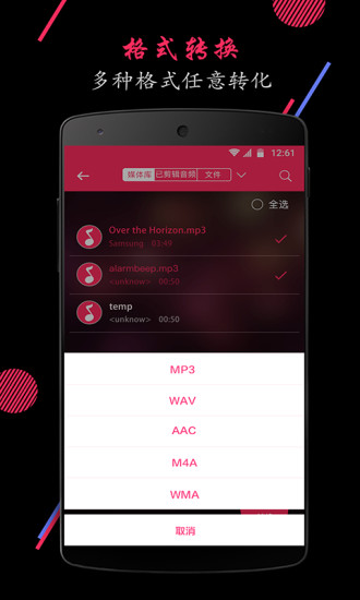 音频裁剪大师app支持制作手机铃声,短信提示音,以及其他各种提醒声音,轻松简单容易上手,快来制作你的专属音乐。有时候想把多首歌曲合并起来当串烧,合成自己想要的音乐?音频裁剪大师软件可以帮助你,或者想制作属于自己独特的手机铃声? 音频裁剪大师手机版能帮助你,软件是您制作手机铃声,短信提示音,以及其他各种提醒声音最佳神器。此外,它还可以从iTunes或本地音乐库或局域网无线导入音频,一键将midei、mp3、amr等音频文件互相转换,合成至同一音段下,或将同一首音乐裁剪出多段音频,一键分享Facebook、微信/QQ、微博等社交平台,感兴趣的用户欢迎下载收藏~