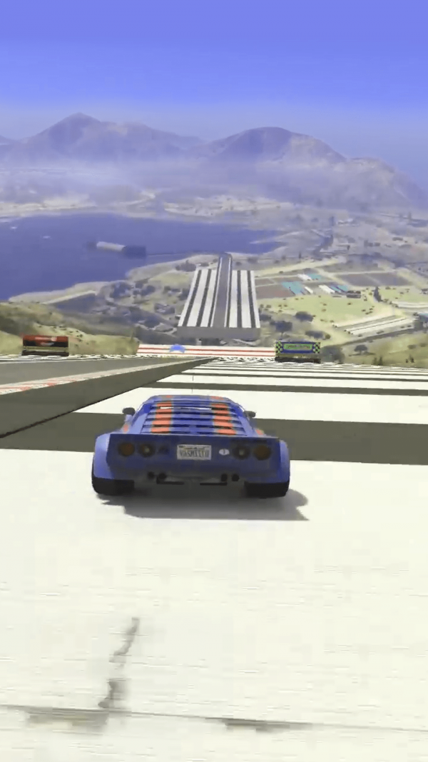 1.驾驶跑车开始冲刺并越过高坡,在空中进行特技表演。