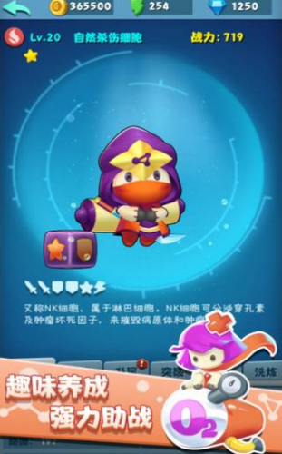 玩家可以通过升级自己的细胞战士,给他提升星级来解锁更强大的技能使它面对细菌可以更加得心应手。
