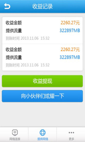 收费记录:收益金额以及提供流量的数据
