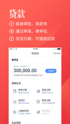 1.贷款:极速审批放款快,通过率高费率低,灵活分期可提前还