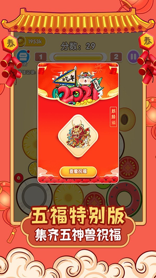 合成大西瓜集五福是一款闲趣味合成类游戏,游戏中你需要将各种水果合成,相同的水果合成会进化,不断扩大水果的体积,全新喜气的界面风格,轻松点击即可合成,融合了时下火爆的五福集合玩法,在合成大西瓜集五福游戏中玩家可以彼岸小厨拿高分,还有机会获得哇能卡,适合各个年龄段的玩家,打发闲暇时间的不二之选!