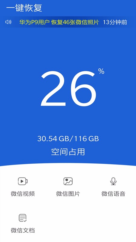 一键恢复app是一款专业的微信数据恢复大师,它与其他的恢复工具不同,全程手机线上操作,无需连接电脑,为你提供一键式恢复功能;使用一键恢复app可以快捷恢复微信聊天记录,还能对手机误删的维修数据快捷恢复,微信聊天中产生的图片、头像、视频、文档等都可以一键快捷恢复,超级方便简单;app使用起来十分方便轻松,超级容易上手,打开进入app主界面后就可以使用了,为你提供了微信视频、微信图片、微信语音、微信文档四大分类,想要恢复什么数据都可以轻松搞定,通过扫描方式,快捷扫描已经删除的内容,选勾后就可以一键恢复。
