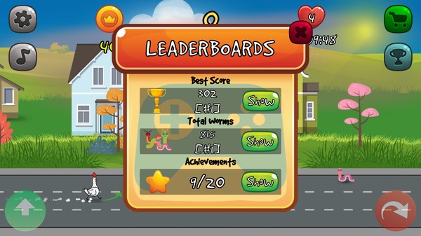 《疯狂小鸡冲刺》是一款充满了节奏感的趣味动物跑酷休闲益智小游戏,游戏中的这个城镇之中将会出现有很多的小鸡,而你也将会拥有一只,接下来的任务就是奔向终点,有很多的小虫子会在路上出现,通过捕食是能够增加你积分的,但是千万不要忘,最终目标是什么,加入进来,看你能不能赢得最终的胜利吧。没有足够的分数,就算你抵达终点了那也不会成功,没有时间的限制,想玩就玩简单的游戏,几分钟就可以,祝你玩的开心。感兴趣的就一起来玩吧。