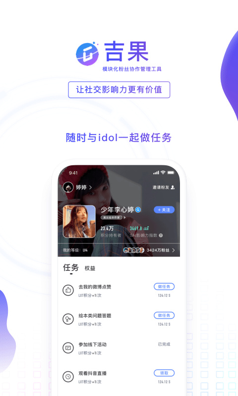 吉果软件赋能社交资产、社交信用指数和社交信用,可量化、可视化、可交易,让粉丝和艺人共享影响力价值;软件对接多个平台,支持社交资产、信用指数以及社交信用数据可视化,帮助提升商业变现,让流量增长,共享价值。这款软件主要是针对粉丝设计的,有了这款软件,粉丝们就能直接在软件内领取各种任务来赚取一定的收入,软件的操作非常的简单而且适合所有的粉丝使用哦!感兴趣的朋友可以直接来麦氪派下载软件体验哦!