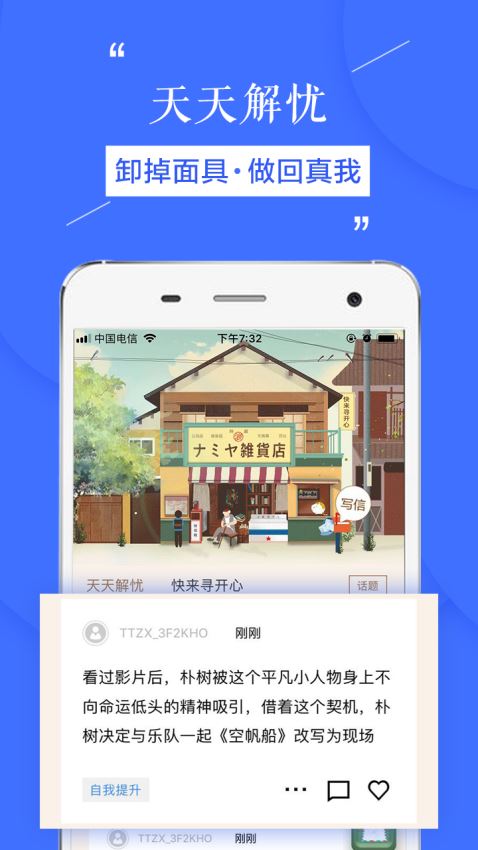 致力于情绪疏导,搭载了轻心理内容基因,避免网络社交“灵魂不在线”状态;