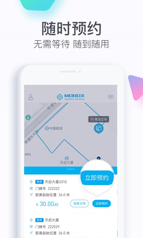 摩宝空间app是一款专为使用者提供空间租赁服务的应用软件,主要面向针对企业会议、教育、娱乐、办公方面,致力于打造一个空间网络共享服务平台,随时随地都能满足移动生活共享智能空间需求;开启手机定位后,系统自动切换定位到当前位置,附近周边的共享空间自动推送给你,同时还为你呈现相关的门牌号、距离位置、收费标准等等,十分贴心;除此之外,app还支持预约下单,提前预约下单付款,轻松解决安排问题,无需等待,即到即用;现在下载还能享受大量新人福利活动。