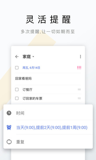 3. 全能提醒:为任务设置日期和提醒,我们有灵活的提醒机制确保你不会错过重要的事情。