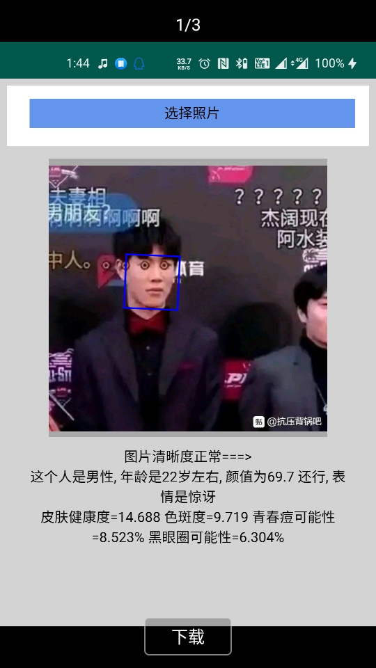 2.通过人脸识别技术,识别出人脸72个特征点,进行大数据分析,返回官方颜值结果。