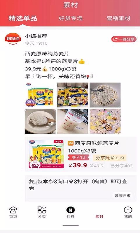 购聚点是一款购物返现软件,在选购心爱商品时提前在app之中领取购物优惠券,给你省下很多的购物资产,从点点滴滴开始,节约每一份钱;另外,您能够在服务平台内协助各种店家推广店铺商品,根据分享商品信息的方法就可以做到推销产品的目地,您只需要花销一点空闲的时间就可以在家赚钱,而且也无需花时间打理店面,随时一键实际操作推销产品,是一款省钱返利APP,购物前先领优惠券,比在电商平台直接下单便宜90%以上,让你以更低的价格买到心仪的。