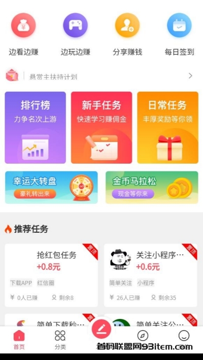 1、用户选择软件任务,可以看资讯、转发分享、试玩项目,或者成为悬赏主发布任务。