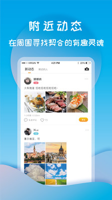 附近动态展示,能够查阅到附近的动态内容,浏览动态;