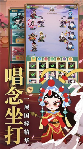 刘邦、项羽、李白、董卓、白素贞等众多历史传奇人物,生旦净末丑一应俱全,他们都将走下舞台,加入你的伙伴阵营,放置布阵,冒险养成。英雄角色融合了京剧等曲艺中的经典造型,洋溢着浓浓的梨园风韵,可定制变化的戏曲装扮,让每一个人物都是是千姿百态,魅力四射。梨园秘境、天下榜文、华夏武会等众多挑战玩法,为你奉献一场场梨园绮梦,曲艺奇缘。